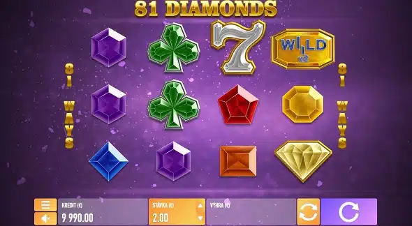 Online automat 81 Diamonds od spoločnosti Tech4Bet je naozaj výnimočný. Okrem toho, že má štyri valce a má až 27 výherných línií. Avšak, ako už naznačuje číslo 81 v názve, môže sa tento počet zvýšiť až na 81 výherných línií pri štyroch rovnakých symboloch v kombinácii. Rovnaký je aj rozsah stávok na jedno zatočenie, ktorý sa pohybuje od 10 centov do 100 eur. Maximálna možná výhra je pri všetkých troch automatoch 50 000 eur pri najvyššej stávke. Tento automat naozaj graficky vyniká , ktorý nahradil ovocné symboly symbolmi drahých kameňov, ponúka pôsobivejšie prostredie a hudbu. Samozrejmosťou je aj  WILD symbol s násobiteľom výhry.