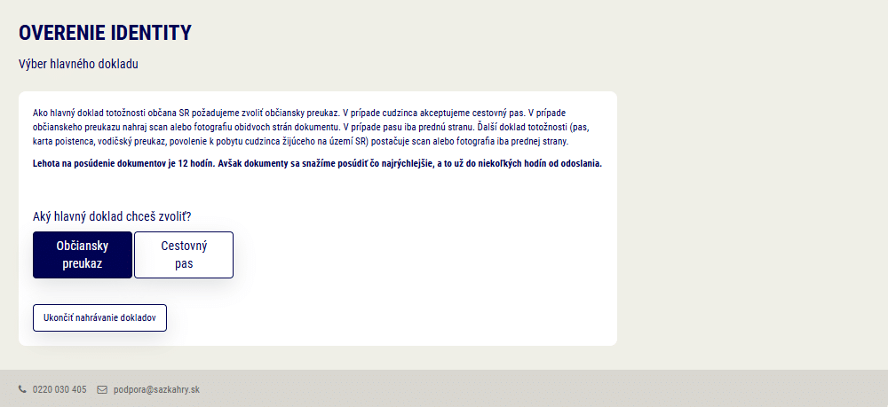 Nahraj fotku občianskeho preukazu a druhého dokladu (napr. cestovný pas). Dôležité je, aby boli údaje dobre čitateľné a dokumenty platné.
