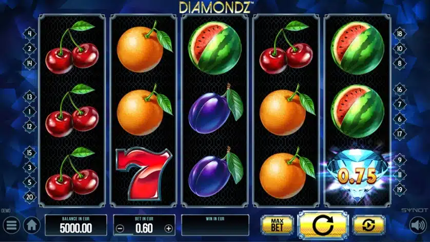 Množstvo automatov od obľúbeného českého vývojára kasínových hier a automatov SYNOT Games by sme mohli označiť za skutočné klenoty. A to isté môžeme povedať aj o diamantovom automate Diamondz. Tento 5-valcový hrací automat s 20 výhernými líniami kombinuje dve obľúbené témy kasínových hier – ovocie a diamanty. Nielen grafická stránka, ale aj prepracované bonusové symboly a špeciálne funkcie robia tento hrací automat mimoriadne obľúbeným. Špeciálne treba spomenúť Scatter symbol Diamond, ktorý sa objavuje na valcoch počas štandardnej hry, prináša náhodné vysoké okamžité výhry a spúšťa bonusové voľné spiny. Počas týchto spinov môžeš tiež získať ďalší Scatter – Diamondz.