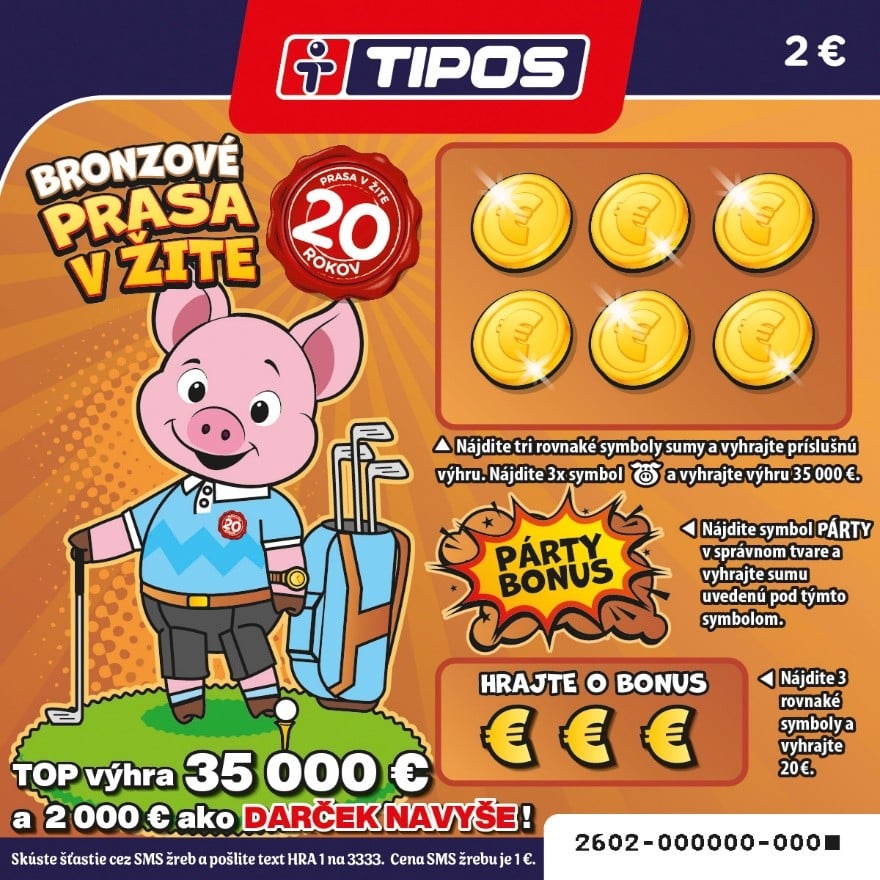 Bronzové prasa v žite od Tiposu je ďalší žreb z obľúbenej série, ktorý ti môže priniesť až 35 000 € len za 2 €. Skús šťastie a možno práve ty vyhráš skvelú sumu! Viac