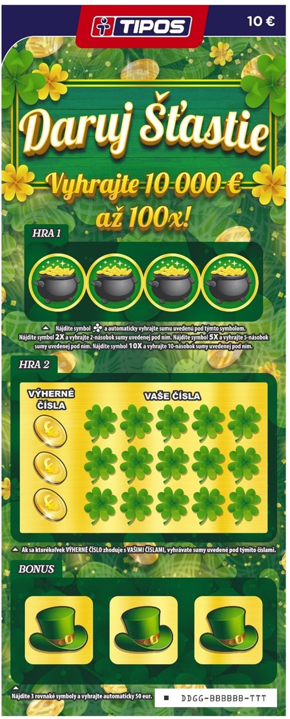 Daruj šťastie od Tiposu je žreb za 10 eur s hlavnou výhrou až 10 000 eur. Vďaka priaznivým šanciam na získanie najvyššej výhry je tento los skvelou príležitosťou, ako si urobiť radosť alebo potešiť niekoho blízkeho! Viac