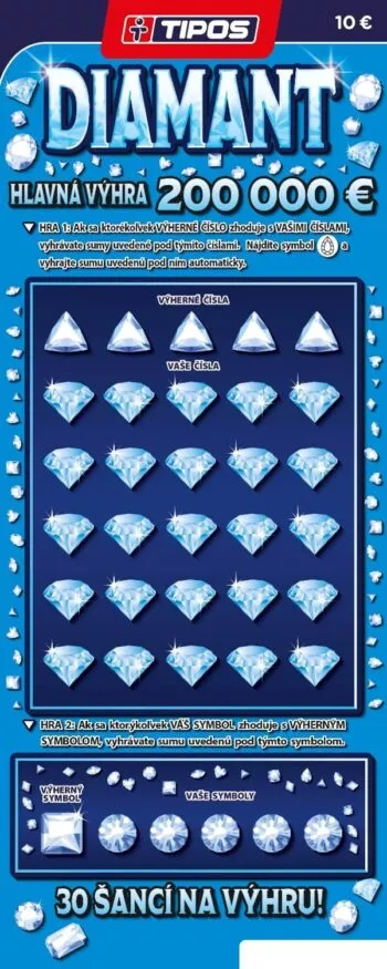 Stierací žreb Diamant má viacero hracích polí. V Hre 1 hľadaj zhodu medzi VÝHERNÝMI ČÍSLAMI a VAŠIMI ČÍSLAMI. Ak ju nájdeš, vyhráš sumy uvedené pod číslom. Ak nájdeš symbol „Diamant“, okamžite vyhráš sumu pod ním. V Hre 2 rovnako ako v prvej hre, hľadaj zhodu. V tomto prípade hľadáš zhodu s „VÝHERNÝM SYMBOLOM“ a „VAŠIM SYMBOLOM“. Ak nájdeš zhodu, vyhráš sumu pod ním.
