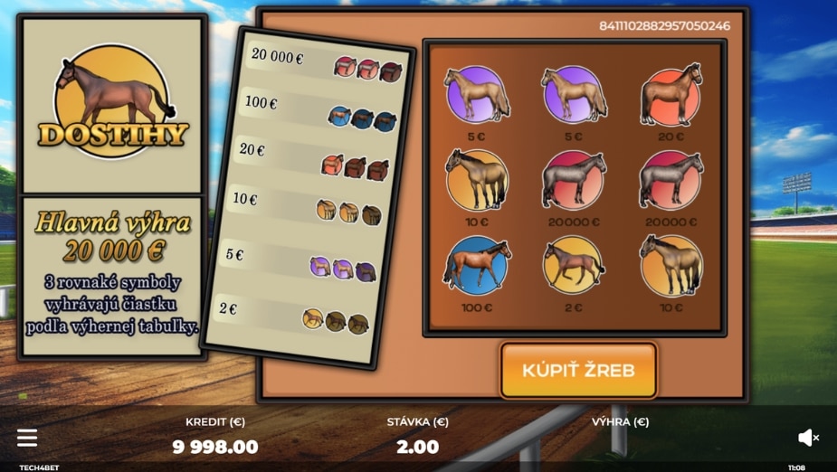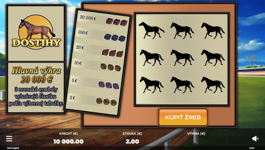 Zaži napätie skutočných dostihov priamo na svojom žrebe. Stierací los Dostihy od Sazkahry stojí 2 € a v hre môžeš získať až 20 000 €. Zotri symboly a zisti, či tvoj kôň dobehne do cieľa ako víťaz. Viac