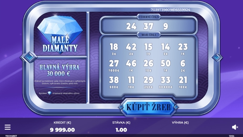 Výhra vznikne vtedy, keď sa čísla v časti moje čísla zhodujú s číslami v poli výherné čísla. Za každú zhodu získaš výhru uvedenú pod príslušným symbolom. Objaviť sa môže aj špeciálny symbol diamant, ktorý ti prinesie okamžitú výhru v hodnote uvedenej pod symbolom.