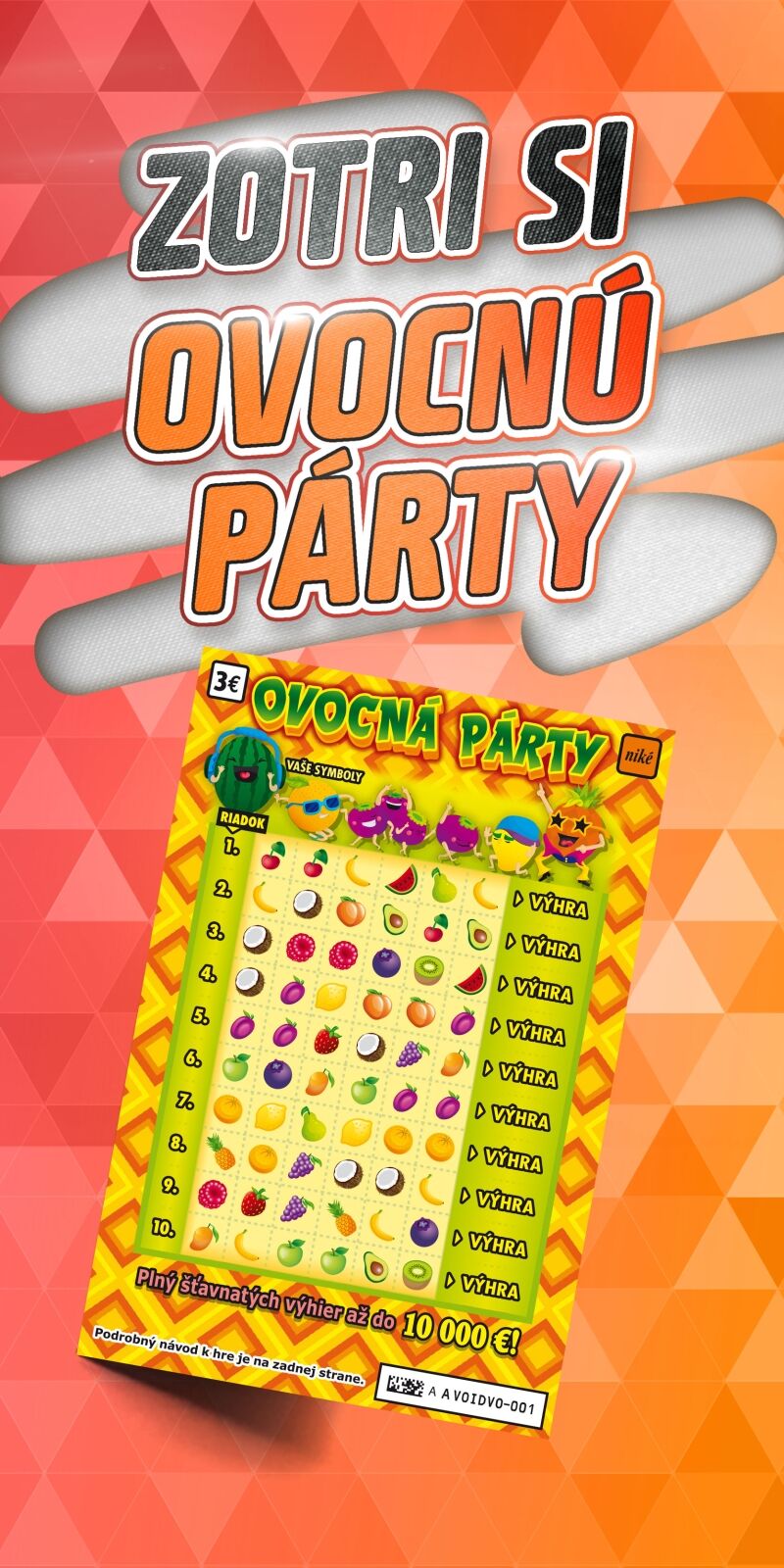 Roztoč zábavu so žrebom Ovocná párty od Niké – za 3 € môžeš vyhrať až 10 000 €! Zotri symboly, namiešaj ovocnú kombináciu a uži si šťavnatú výhru. Viac