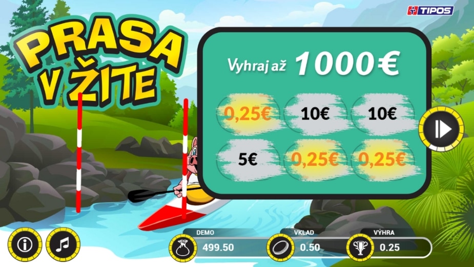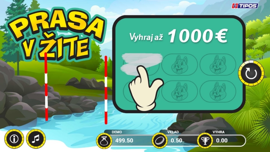 Stierací žreb Prasa v žite od Tiposu má jedno hracie pole a jednoduché pravidlá. Zotri celé pole a nájdi 3 zhodné sumy. Ak sa ti to podarí vyhráš danú sumu. Ak sa ti podarí nájsť 3-krát symbol „Prasa“, vyhráš hlavnú výhru, čiže 1 000 €.