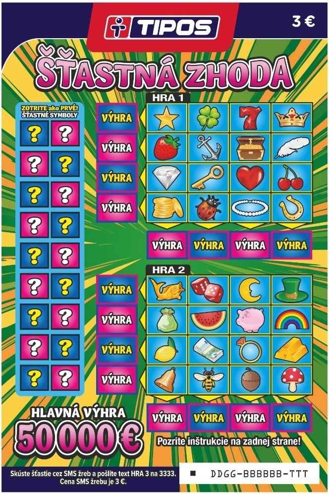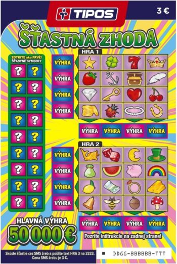 Stierací žreb Šťastná zhoda obsahuje viacero hracích polí. Najskôr zotri celé pole s otáznikmi – „ŠŤASTNÉ SYMBOLY“. Následne v poliach označených „HRA 1 a/alebo 2“ zotri iba tie symboly, ktoré sú zhodné so „ŠŤASTNÝMI SYMBOLMI“. Ak nájdeš zhodu medzi „ŠŤASNÝMI SYMBOLMI“ a 4 symbolmi v jednom stĺpci alebo riadku, v „hrách 1 alebo 2“, gratulujeme, vyhráš sumu, ktorá prináleží k stĺpcu alebo riadku.