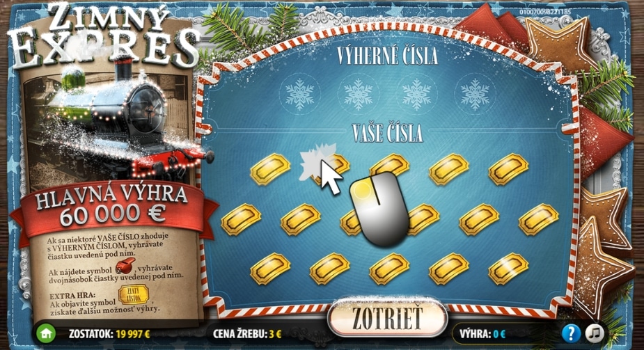Online stierací žreb od Tiposu Zimný expres má 2 hracie polia. Zotri „VÝHERNÉ ČÍSLA“ a „VAŠE ČÍSLA“ a potom medzi nimi nájdi zhodu. Ak sa ktorékoľvek Vaše číslo zhoduje s Výherným číslom, vyhráš sumu pod číslom. Nájdi symbol „PÍŠŤALKA“ a vyhráš dvojnásobok sumy pod ním. Bonusový symbol Zlatý lístok znamená EXTRA HRU. Extra hra ti dá možnosť odkryť 2 polia na Zlatom lístku a zvýšiť svoju výhru.